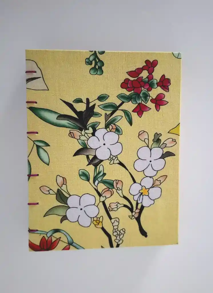 Cuaderno tapa dura con lomo expuesto, forrado con tela con estampado de flores 100 hojas ecológicas color natural Costura hecha a mano color purpura Tamaño A6 = 14.1cm * 11cm Encuadernación artesanal 100% hecha a mano Producto local