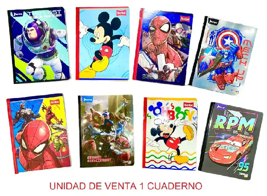 Cuaderno Cosido con Stickers Para Niño Rayado 100 Hojas Scribe-Norma. Se envia personaje segun disponibilidad
