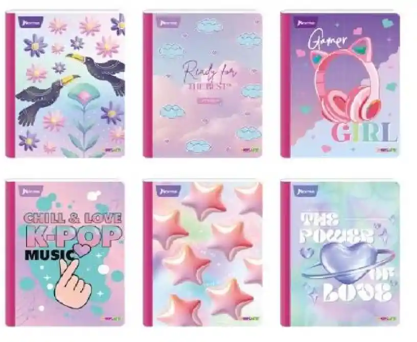 Cuaderno Cosido Grande Femenino, 100h Doble Linea Con Sticker