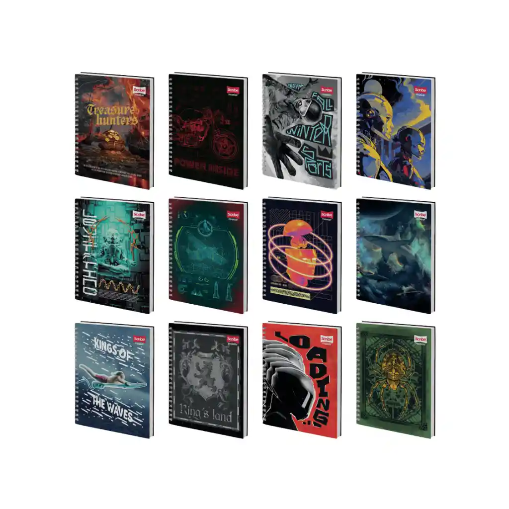 Cuaderno Master Multimaterias Masculino con pasta dura plastificada y diseños modernos. Disponible en 5 y 7 materias, ideal para estudiantes organizados.