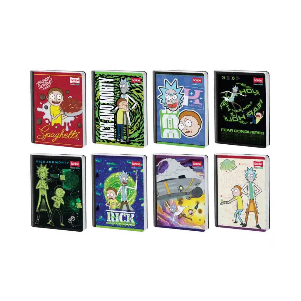 Cuaderno Scribe cosido con cinta lomo negra, acabado UV Matte y alto relieve. Incluye hoja de stickers y 8 diseños surtidos.
