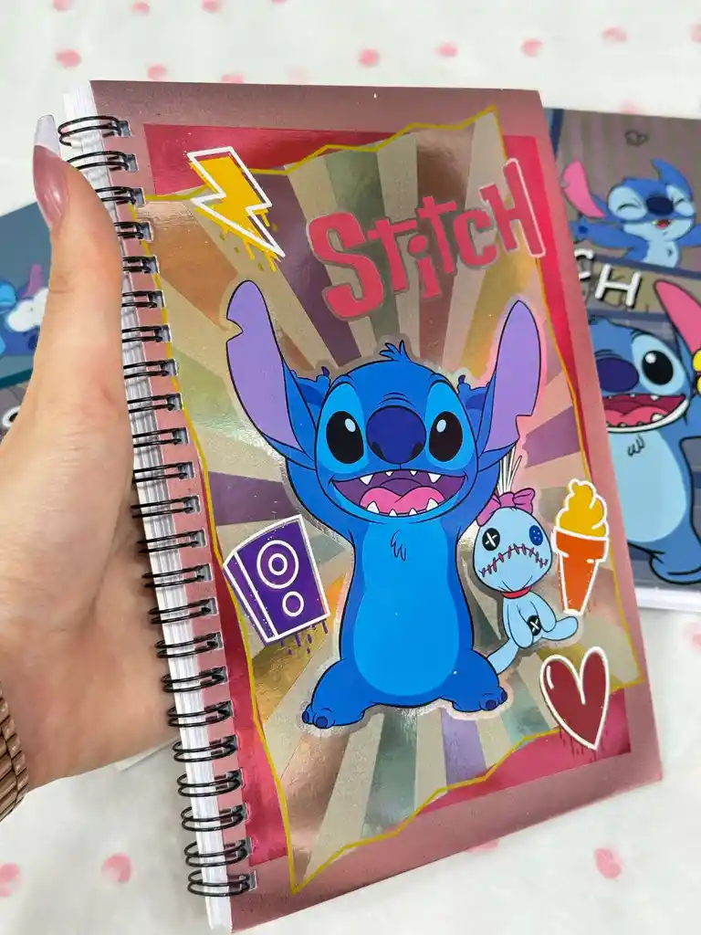 ¡Los cuadernos metalizados de Stitch son una opción genial para darle un toque divertido y brillante a tus útiles escolares o de oficina! Aquí te detallo algunas de sus características: Características principales: Acabado llamativo:La cubierta metalizada le da un aspecto moderno y vibrante, haciendo que el cuaderno destaque. Los diseños de Stitch suelen estar impresos con colores brillantes y detalles que resaltan con el efecto metalizado. Diseños variados:Puedes encontrar una amplia gama de diseños de Stitch, desde sus expresiones más traviesas hasta imágenes más tiernas. Algunos cuadernos pueden incluir detalles holográficos o con relieve para un efecto aún más especial.