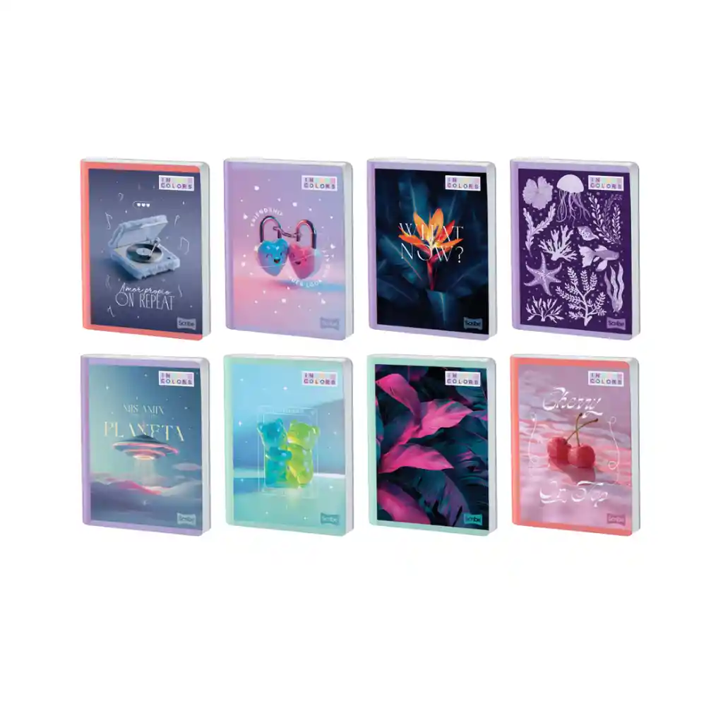 Cuaderno Scribe con lomo de colores, laminado mate, detalles metalizados y hoja de stickers. Disponible en 16 diseños únicos y decorados.