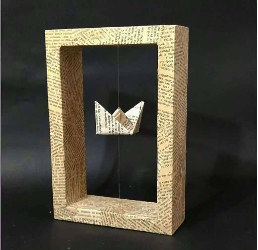 Cuadro con un barco en origami en papel de libro antiguo medidas 25cm*17cm