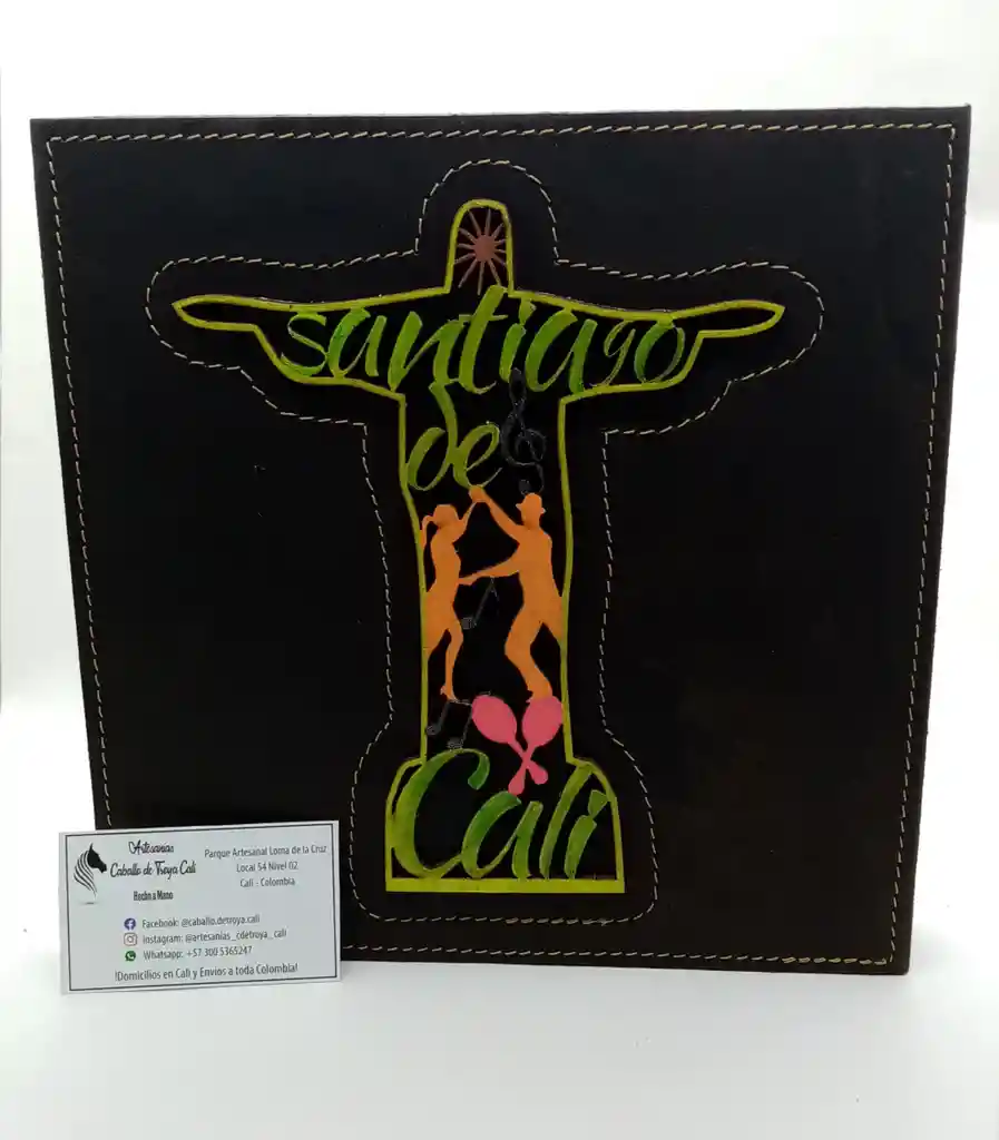 Elaborados en cuero de alta calidad con aplique representativos de la ciudad de Cali como lo son el Gato de Tejada, Cristo Rey y Sebastián de Belalcázar, son pintados a mano. 100% Hecho a Mano.