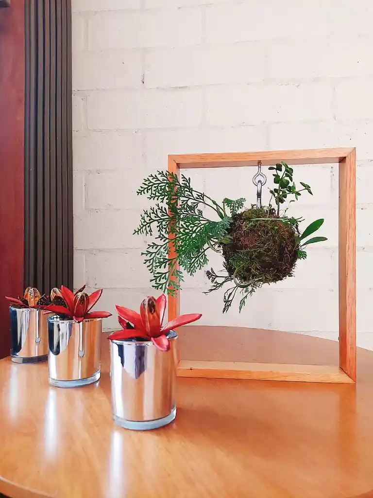 Cuadro decorativo con Kokedama. Marco en madera (21 CM X 26 CM X 4 CM) Aprox. Diámetro Kokedama 8 CM