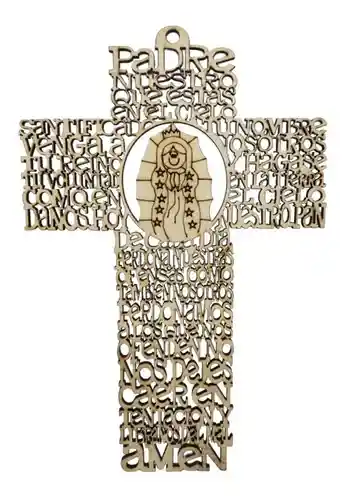 Cuadro religioso con diseño de la virgen y oracion del padre nuestro en madera, Puede colgarse en la pared. Cuenta con medidas de 21 X 14 Centimetros. Material : Madera MDF. Se puede pintar de cualquier color con pintura para darle un mejor toque.