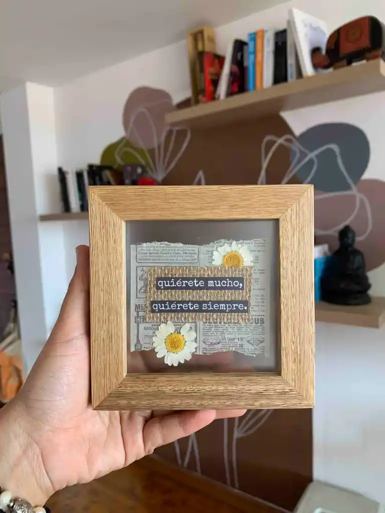 Frase: Quiérete mucho, quiérete siempre". Con la técnica del collage. Dimensiones: 10x10cm para mesitas o escritorio. El marco es en madera flor morado. Y viene en doble vidrio.