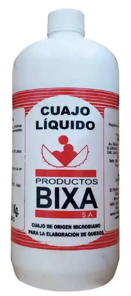 CUAJO LIQUIDO DE ORIGEN MICROBIANO PARA LA ELABORACIÒN DE QUESOS. INGREDIENTES: AGUA, CLORURO DE SODIO, ENZIMAS COAGULANTES Y SALES CONSERVANTES.