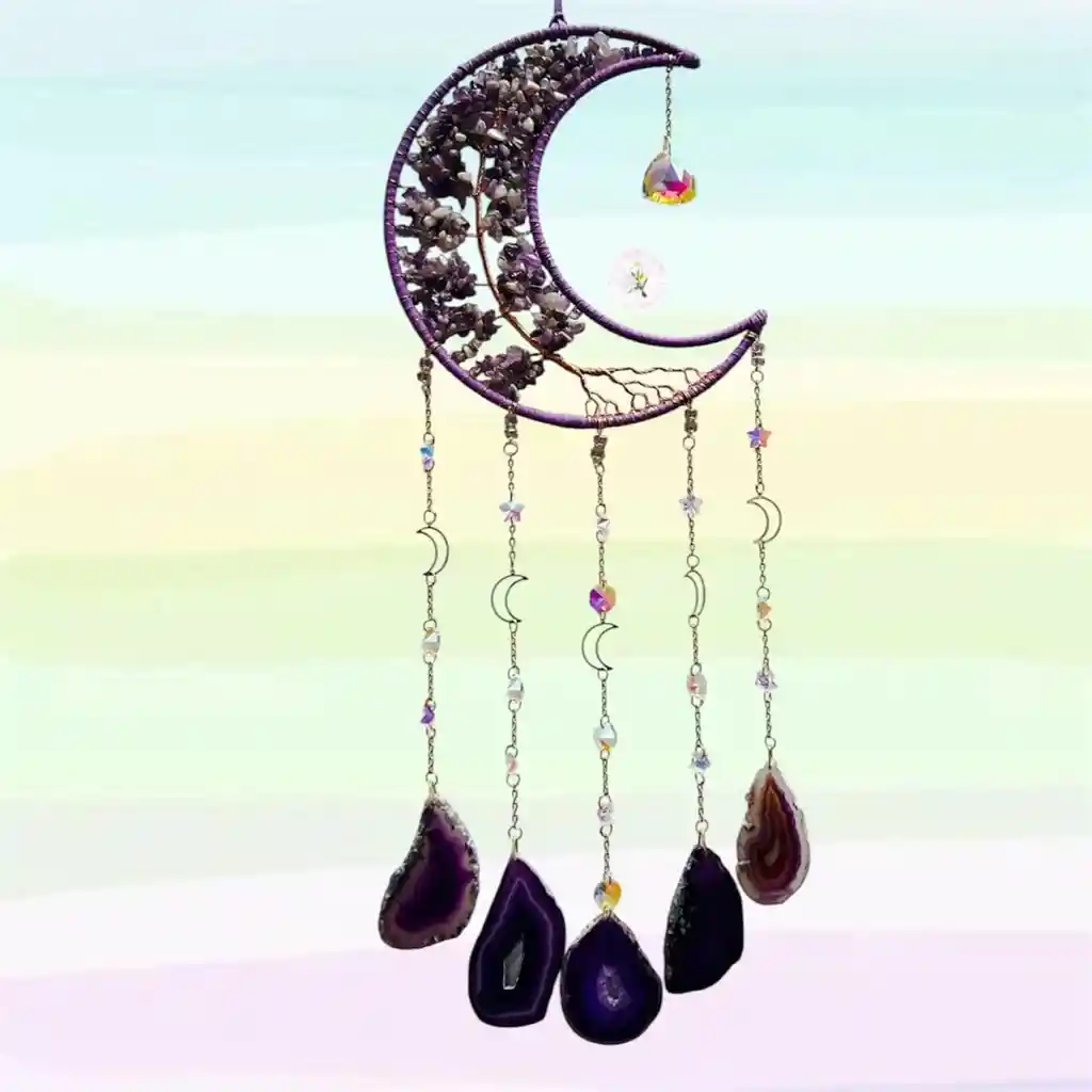 Elegante colgante con forma de luna, hecho de cuarzo morado natural de gran tamaño. Perfecto para aportar energía positiva y un toque místico a tu estilo.