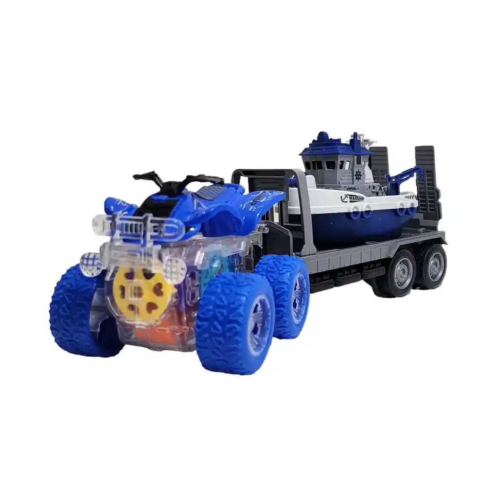 ¡Prepárate para una doble aventura por tierra y mar con este increíble set de transporte! Una poderosa cuatrimoto con un diseño espectacular lidera la expedición, luciendo un chasis transparente que revela un fascinante show de engranajes de colores y luces mientras se mueve. Engancha su remolque de alta resistencia para transportar el detallado barco hacia su próximo destino acuático. Al encenderlo, este vehículo todo terreno cobra vida y avanza por sí solo, mostrando su increíble mecanismo interno en acción. Es el juguete 3 en 1 perfecto para los pequeños exploradores, combinando la emoción de la velocidad en tierra con la imaginación de las aventuras náuticas para horas de juego sin fin. Ficha Técnica: Material: Plástico ABS Dimensiones Del Vehículo : 27 cm x 10 cm x 8 cm Apto para: + 3 Años Referencia: YM-1109T1 Certificado de conformidad: CS-LCO-13233-2021S2/432 ** _Para defectos de fábrica o retractos: \_Por favor revise el producto apenas lo reciba y antes de usarlo. No aplican ley de retracto o defectos de fábrica luego de usar el producto. Se manejan máximo 5 días para reportar defectos de fábrica (por ejemplo, producto funciona mal, piezas faltantes, rotas, etc). Para hacer efectiva la devolución el producto debe devolverse con el empaque original, el cual debe estar en buen estado, incluir todos los documentos y las partes completas y sin daños.