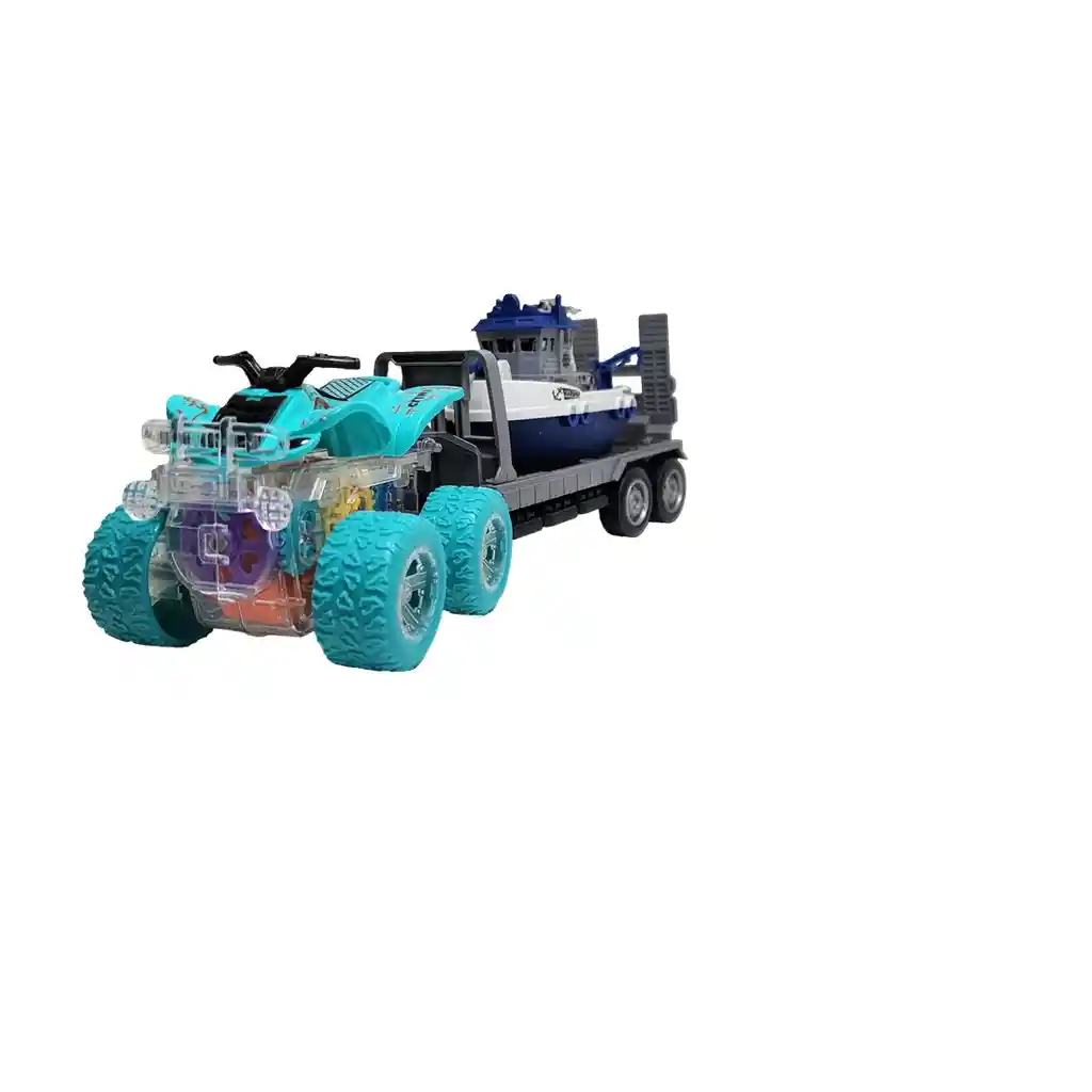 ¡Prepárate para una doble aventura por tierra y mar con este increíble set de transporte! Una poderosa cuatrimoto con un diseño espectacular lidera la expedición, luciendo un chasis transparente que revela un fascinante show de engranajes de colores y luces mientras se mueve. Engancha su remolque de alta resistencia para transportar el detallado barco hacia su próximo destino acuático. Al encenderlo, este vehículo todo terreno cobra vida y avanza por sí solo, mostrando su increíble mecanismo interno en acción. Es el juguete 3 en 1 perfecto para los pequeños exploradores, combinando la emoción de la velocidad en tierra con la imaginación de las aventuras náuticas para horas de juego sin fin. Ficha Técnica: Material: Plástico ABS Dimensiones Del Vehículo : 27 cm x 10 cm x 8 cm Apto para: + 3 Años Referencia: YM-1109T1 Certificado de conformidad: CS-LCO-13233-2021S2/432 ** _Para defectos de fábrica o retractos: \_Por favor revise el producto apenas lo reciba y antes de usarlo. No aplican ley de retracto o defectos de fábrica luego de usar el producto. Se manejan máximo 5 días para reportar defectos de fábrica (por ejemplo, producto funciona mal, piezas faltantes, rotas, etc). Para hacer efectiva la devolución el producto debe devolverse con el empaque original, el cual debe estar en buen estado, incluir todos los documentos y las partes completas y sin daños.
