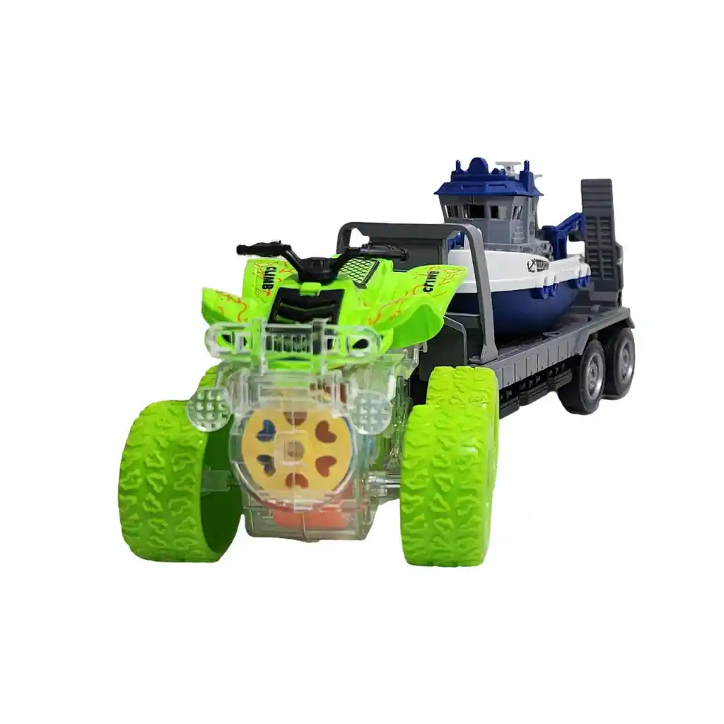 ¡Prepárate para una doble aventura por tierra y mar con este increíble set de transporte! Una poderosa cuatrimoto con un diseño espectacular lidera la expedición, luciendo un chasis transparente que revela un fascinante show de engranajes de colores y luces mientras se mueve. Engancha su remolque de alta resistencia para transportar el detallado barco hacia su próximo destino acuático. Al encenderlo, este vehículo todo terreno cobra vida y avanza por sí solo, mostrando su increíble mecanismo interno en acción. Es el juguete 3 en 1 perfecto para los pequeños exploradores, combinando la emoción de la velocidad en tierra con la imaginación de las aventuras náuticas para horas de juego sin fin. Ficha Técnica: Material: Plástico ABS Dimensiones Del Vehículo : 27 cm x 10 cm x 8 cm Apto para: + 3 Años Referencia: YM-1109T1 Certificado de conformidad: CS-LCO-13233-2021S2/432 ** _Para defectos de fábrica o retractos: \_Por favor revise el producto apenas lo reciba y antes de usarlo. No aplican ley de retracto o defectos de fábrica luego de usar el producto. Se manejan máximo 5 días para reportar defectos de fábrica (por ejemplo, producto funciona mal, piezas faltantes, rotas, etc). Para hacer efectiva la devolución el producto debe devolverse con el empaque original, el cual debe estar en buen estado, incluir todos los documentos y las partes completas y sin daños.
