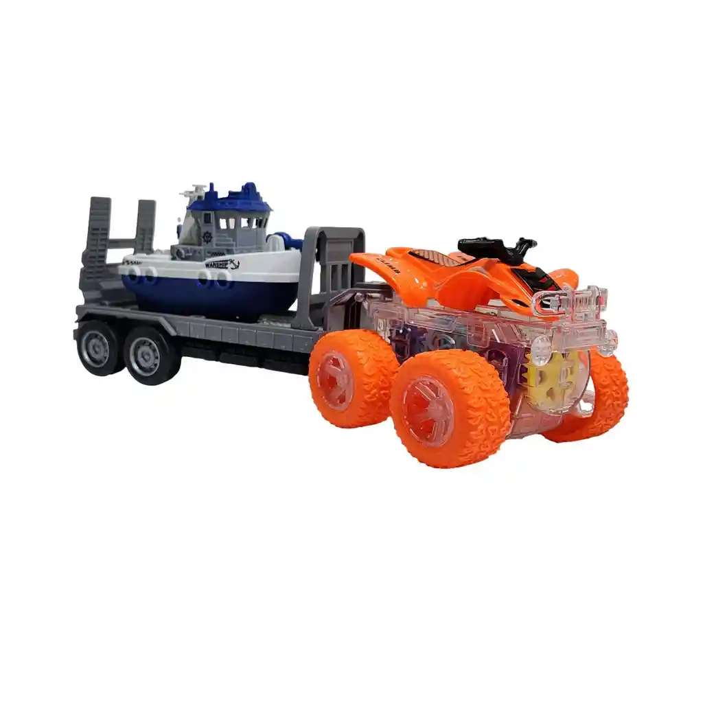 ¡Prepárate para una doble aventura por tierra y mar con este increíble set de transporte! Una poderosa cuatrimoto con un diseño espectacular lidera la expedición, luciendo un chasis transparente que revela un fascinante show de engranajes de colores y luces mientras se mueve. Engancha su remolque de alta resistencia para transportar el detallado barco hacia su próximo destino acuático. Al encenderlo, este vehículo todo terreno cobra vida y avanza por sí solo, mostrando su increíble mecanismo interno en acción. Es el juguete 3 en 1 perfecto para los pequeños exploradores, combinando la emoción de la velocidad en tierra con la imaginación de las aventuras náuticas para horas de juego sin fin. Ficha Técnica: Material: Plástico ABS Dimensiones Del Vehículo : 27 cm x 10 cm x 8 cm Apto para: + 3 Años Referencia: YM-1109T1 Certificado de conformidad: CS-LCO-13233-2021S2/432 ** _Para defectos de fábrica o retractos: \_Por favor revise el producto apenas lo reciba y antes de usarlo. No aplican ley de retracto o defectos de fábrica luego de usar el producto. Se manejan máximo 5 días para reportar defectos de fábrica (por ejemplo, producto funciona mal, piezas faltantes, rotas, etc). Para hacer efectiva la devolución el producto debe devolverse con el empaque original, el cual debe estar en buen estado, incluir todos los documentos y las partes completas y sin daños.