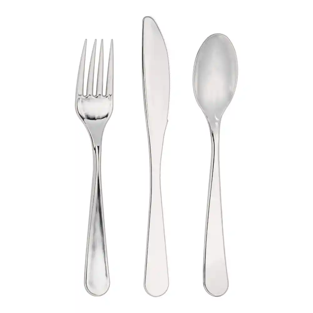Cada paquete trae 4 cubiertos de cada uno Tamaño: Cuchillo: 19,05 cm. Tenedor: 17,78 cm. Cuchara: 17,14 cm Material: Plástic