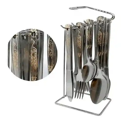 Juego de cubiertos en acero inoxidable, con tallado y finos detalles. Incluye 24 piezas con soporte:• 6 Cucharas• 6 Tenedores• 6 Cucharas dulceras• 6 Cuchillos• Base para organizar los cubiertos