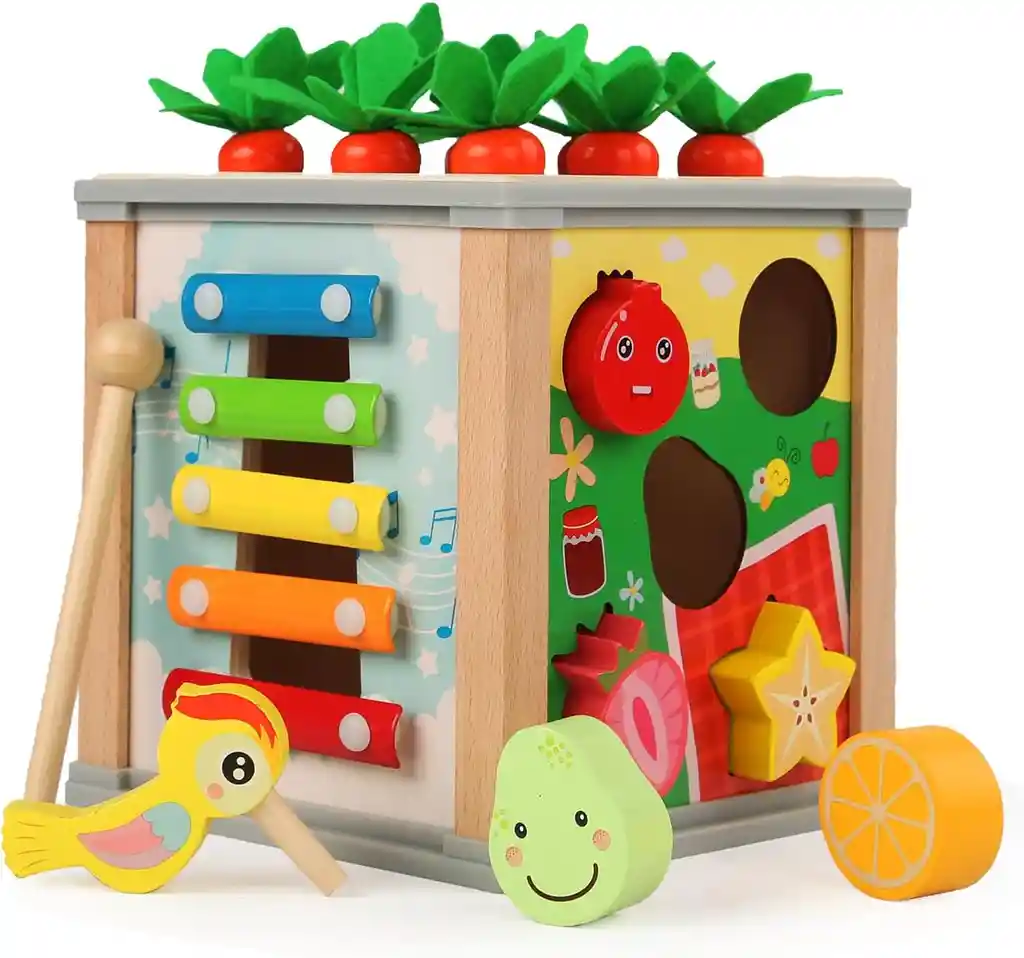 Material: Madera y plástico. Dimensiones: 16,5 cm x 16,5 cm x 17 cm. Edad recomendada: A partir de 12 meses. CARACTERÍSTCAS: - Tiene 5 lados de actividades con colores brillantes, formas divertidas, bonitos personajes y partes móviles que divertirán a tu pequeño durante horas. - Actividades: 1) Cosecha de zanahorias 2) Engranajes giratorios. 3) Reloj. 4) Xilófono. 5) Clasificación de formas de frutas. 6)Cosecha de zanahorias. - Aprendizaje Divertido: El Cubo de Actividades Craiiby Montessori es un juguete educativo diseñado para estimular el aprendizaje y la creatividad en los niños pequeños. Con múltiples actividades, este cubo proporciona horas de entretenimiento educativo. - Enfoque Montessori: Inspirado en el enfoque pedagógico Montessori, este juguete fomenta la independencia, la concentración y el aprendizaje a través del juego. - Exploración Sensorial: Cada lado del cubo presenta actividades diferentes para fomentar la exploración sensorial. Los niños pueden tocar, girar y descubrir para desarrollar habilidades táctiles y cognitivas.