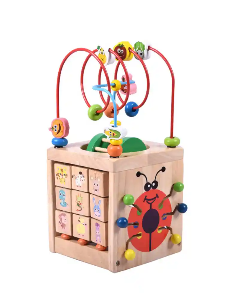 Descubre un mundo de aprendizaje y juego con este cubo multifuncional de madera, diseñado para estimular la inteligencia emocional, la motricidad fina y la imaginación en niños pequeños. Con ilustraciones encantadoras, piezas móviles y un laberinto de cuentas en la parte superior, este juguete es ideal para fomentar el desarrollo integral desde los 18 meses. 🌟 Características y Beneficios: - Reconocimiento emocional: Rueda giratoria con expresiones faciales como “Feliz”, “Triste”, “Enojado” y “Sorprendido” que ayuda a los niños a identificar y expresar sus emociones. - Juego simbólico y narrativo: Bloques giratorios con animales como oso, conejo y elefante, ideales para crear historias y estimular el lenguaje. - Motricidad fina: Laberinto de cuentas con formas de insectos y animales que fortalecen la coordinación ojo-mano y la destreza manual. - Exploración sensorial: Texturas, colores vivos y elementos táctiles como los botones alrededor de la mariquita invitan al juego exploratorio. - Materiales seguros y duraderos: Madera ecológica con acabados suaves, bordes redondeados y pintura no tóxica. - Diseño Montessori: Promueve el juego autónomo, la curiosidad y el aprendizaje práctico