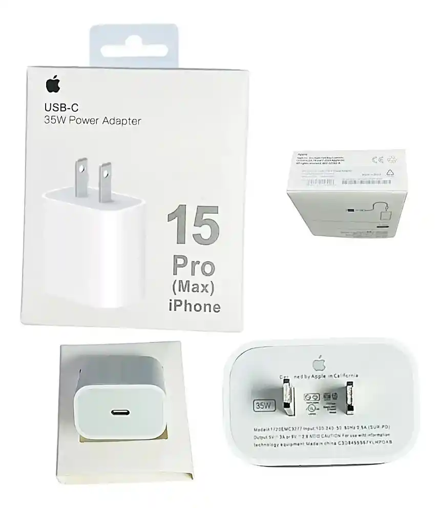 Potencia de 35W, lo que permite una carga rápida. Compatible con cualquier dispositivo que tenga un puerto USB-C. El uso de un cargador de 35W no daña los modelos de iPhone compatibles. Se recomienda usar cargadores originales para evitar riesgos de descargas eléctricas o daños al dispositivo.