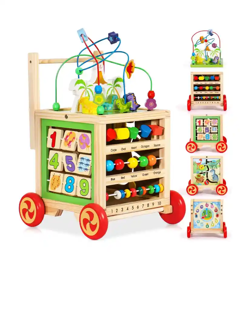 ¡Aprender jugando nunca fue tan divertido! Este cubo multifuncional está diseñado para estimular el desarrollo integral de los niños a través del juego interactivo. Con seis lados llenos de actividades y un diseño móvil con ruedas, es perfecto para pequeños exploradores que están descubriendo el mundo. ✨ Características y Beneficios • 🎢 Laberinto de cuentas en la parte superior Desarrolla la motricidad fina, la coordinación ojo-mano y el reconocimiento de colores. • ⚙️ Panel de engranajes y encaje de formas Fomenta el pensamiento lógico y la resolución de problemas al clasificar y girar piezas. • ⏰ Reloj y fichas numéricas Introduce conceptos básicos de tiempo y números de forma lúdica y manipulativa. • 🔢 Ábaco de conteo Apoya habilidades matemáticas tempranas como contar, agrupar y secuenciar. • 🧩 Rompecabezas deslizante y bloques numéricos Estimula la memoria, la conciencia espacial y el reconocimiento numérico. • 🚶 Diseño móvil con ruedas Montado sobre ruedas rojas resistentes y con asa para empujar, ideal como andador para fortalecer la motricidad gruesa y la autonomía.