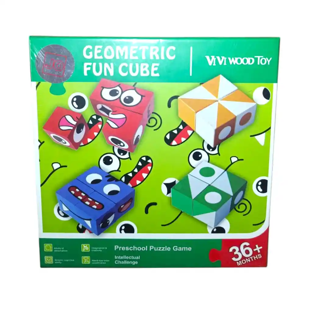El Geometric Fun Cube de ViVi Wood Toy es un juego de rompecabezas educativo ideal para niños mayores de 36 meses. Incluye cubos de madera con divertidas caras y patrones geométricos que estimulan la observación, la coordinación mano-ojo, la creatividad y el pensamiento lógico. Perfecto para desarrollar habilidades cognitivas desde la etapa preescolar de forma lúdica y colorida.
