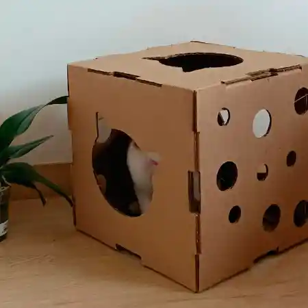 El cartón no solo es un aislante increíble, sino que el pequeño espacio que ofrecen las cajas alienta a tu gato a acurrucarse y relajarse, lo que lo convierte en un espacio cómodo y cálido, estas cajas modulares ayudan a reducir el estrés y ofrecen una zona segura donde tu gato puede observar y no ser visto. Esto es ideal para los felinos, ya que su reacción a situaciones estresantes es a menudo correr y esconderse Este cubo modular cuenta con las siguientes medidas 33 cm x 33 cm Doble refuerzo de cartón 100% reciclables Fácil de armar y desarmar