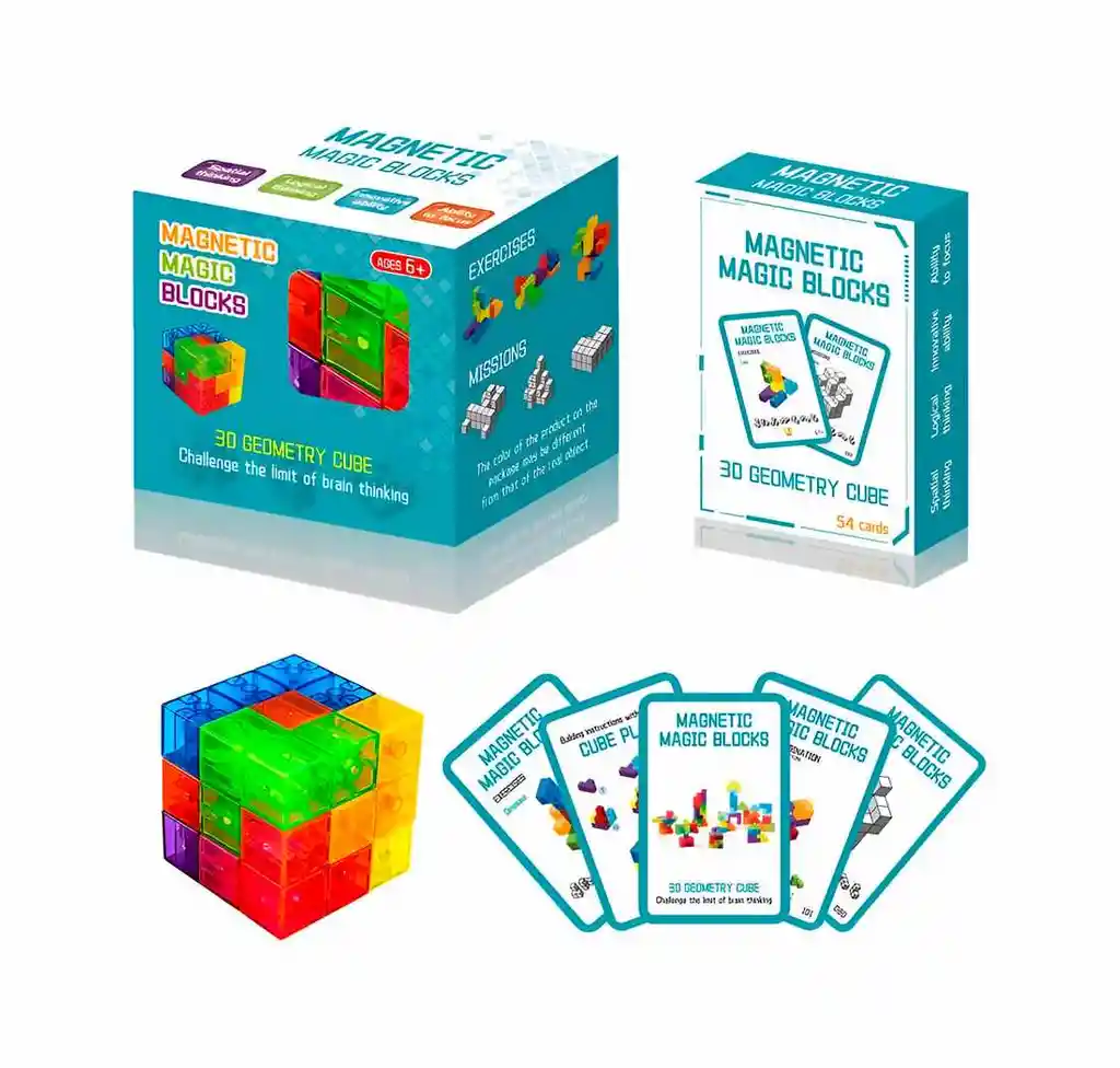 Convierte el aprendizaje en diversión con el set Magnetic Magic Blocks 3D Geometry Cube, un innovador juego de bloques magnéticos en colores vibrantes que permite crear infinitas figuras y estructuras en 3D; ideal para niñas y niños a partir de 6 años, estimula la imaginación, desarrolla el pensamiento lógico y potencia la creatividad mientras resuelven retos y misiones incluidas en las tarjetas del juego, ofreciendo horas de entretenimiento educativo y estimulante. Ficha Técnica: Dimensiones del cubo: 6 cm x 6 cm x 6 cm Material: Plástico ABS Referencia: CU1209 Certificado de conformidad: CS-LCO-13233-2021S2/432 Edad recomendada: + 6 años Términos de garantía: Para defectos de fábrica o retractos: Por favor revise el producto apenas lo reciba y antes de usarlo. No aplican ley de retracto o defectos de fábrica luego de usar el producto. Se manejan máximo 5 días para reportar defectos de fábrica (por ejemplo, producto funciona mal, piezas faltantes, rotas, etc). Para hacer efectiva la devolución el producto debe devolverse con el empaque original, el cual debe estar en buen estado, incluir todos los documentos y las partes completas y sin daños.