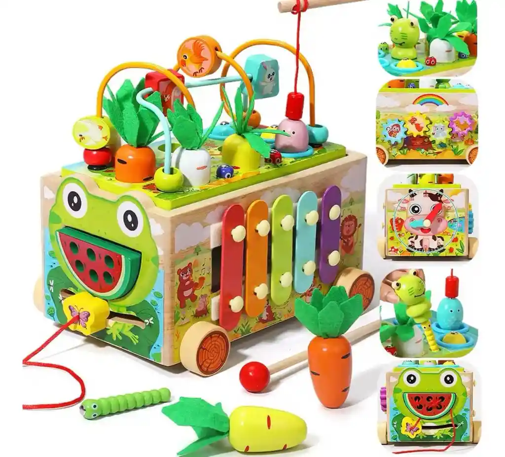 Este juguete educativo de madera es un centro de actividades multifuncional ideal para el desarrollo temprano de los niños. Diseñado con colores vibrantes y elementos interactivos, fomenta la coordinación y la creatividad. Características principales: Material seguro y duradero: Fabricado en madera de alta calidad con pintura no tóxica. Multifuncional: Incluye un xilófono, un juego de pesca magnética, engranajes giratorios, un reloj didáctico y un set de extracción de zanahorias. Diseño interactivo: Con una temática de ranita y elementos de granja que capturan la atención de los niños. Cantidad de piezas: 1 caja de actividades con ruedas. 5 zanahorias de diferentes tamaños con hojas de fieltro. 2 gusanos magnéticos para extraer. 2 peces magnéticos con caña de pescar. 1 martillo de madera para el xilófono. 1 cuerda para arrastrar el juguete. 3 engranajes de colores. 1 reloj didáctico con manecillas móviles. Este juguete es perfecto para niños a partir de 2 años, ayudándolos a desarrollar habilidades cognitivas y motoras mientras se divierten. ¡Una excelente opción para un regalo educativo y entretenido!
