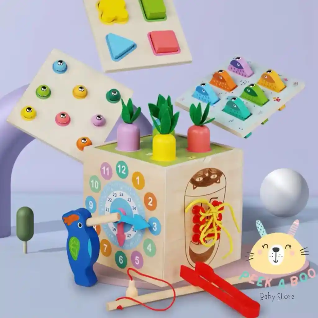 Cubo multifuncional 7 en 1 Este cubo educativo es una excelente herramienta para el desarrollo integral de los más pequeños. Diseñado con múltiples actividades en una sola estructura, fomenta la motricidad fina, el razonamiento lógico y la estimulación sensorial, todo mientras se divierten. Incluye 7 funciones diferentes: Laberinto de cuentas en 3D en la parte superior, ideal para la coordinación ojo-mano. Reloj didáctico con manecillas móviles para aprender a reconocer la hora. Ábaco de colores para iniciarse en el conteo y la clasificación. Encaje de figuras geométricas para el reconocimiento de formas y colores. Tablero de letras y números giratorios con ilustraciones. Engranajes móviles para explorar la relación causa-efecto. Rompecabezas deslizante que estimula la memoria visual y la resolución de problemas. Características principales: Fabricado en madera de alta calidad con acabados seguros. Pintura ecológica no tóxica. Bordes redondeados para mayor protección. Diseño compacto y resistente. Actividades distribuidas en las seis caras y parte superior del cubo. Promueve la concentración, el desarrollo cognitivo, la lógica y la imaginación. Recomendado a partir de los 12 meses. Ideal como centro de actividades en casa o en entornos educativos.