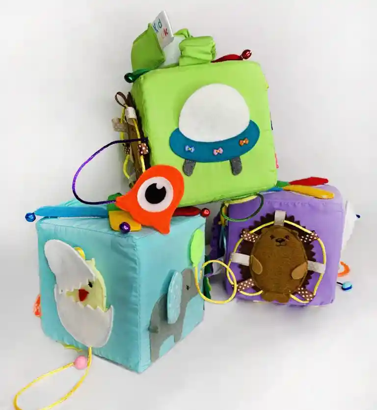 Nuestros cubos sensoriales hechos a mano tienen seis caras y en cada una de ellas se recrean de forma divertida y animada actividades que fomentan el desarrollo motriz de los niños encontrando lo divertido y lo simple en un solo lugar. El cubo tiene unas medidas de 15x15 cm, muy liviano y fácil de llevar, tiene una manilla con resorte para poder llevar a todo lado, recomendado para niños entre los 0 y 18 meses, muy útil y práctico entretener a nuestros pequeños en el carro, el coche, o el avión. Viene con una bolsa de tela Kidbuk para guardar. Las actividades pueden incluir el pollito que sale de su huevo, puercoespín de la pena, pulpo de texturas, el elefante, el laberinto con imán, el ratón come queso, el pez hambriento y las cintas de colores. *Cada cubo puede tener actividades mezcladas. * Las imágenes son fotos de referencia, contiene una unidad.