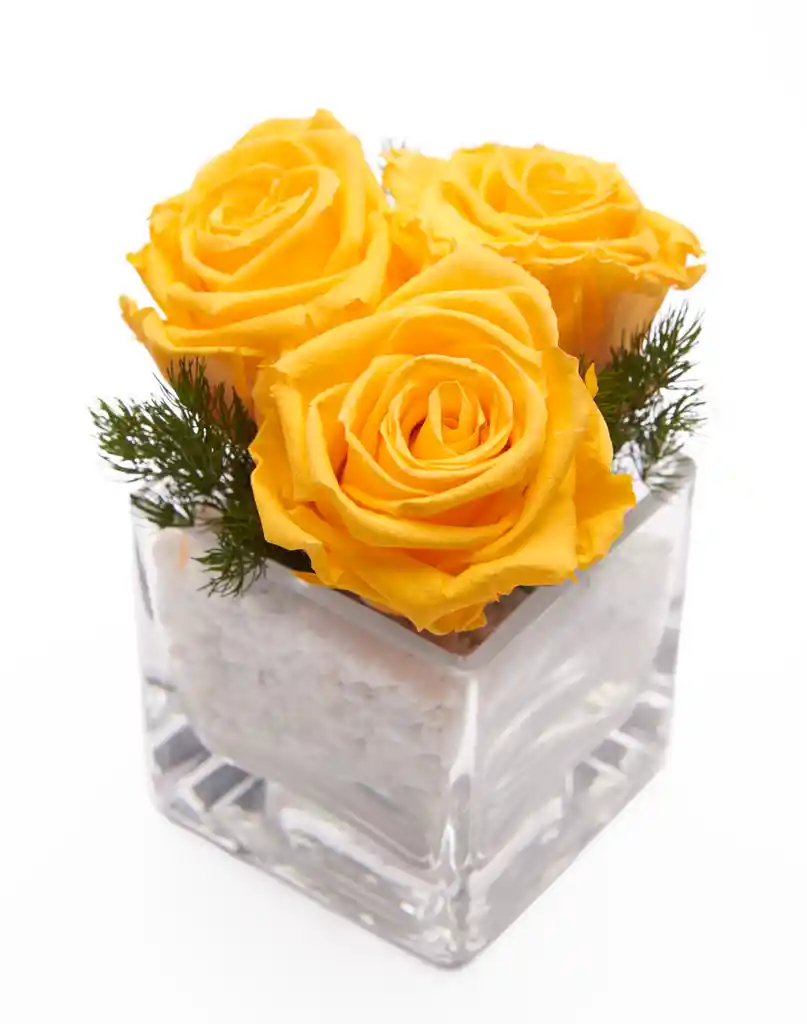 Cubo de vidrio 7x7 con 3 rosas natural estandar preservadaa