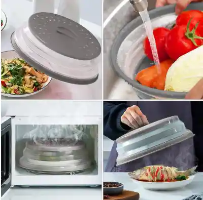 - Está hecha de plástico de calidad alimentaria PP + TPR, no tóxico y sin BPA. Se puede utilizar para calentar alimentos sin preocuparse por dañar el cuerpo. - La cubierta de alimentos para calentar el microondas tiene un material suave y se puede doblar en forma de plato, lo que ahorra mucho espacio en la cocina.