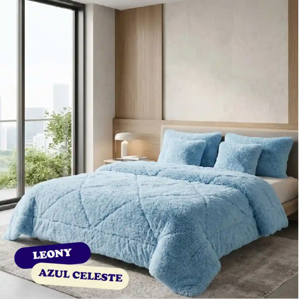 Cubrelecho Doble Peludo Celeste 5 Piezas, doble faz con piel de ángel. Medidas: Para cama doble 140 x 190 cm Plumón: 220x240 cm Dos fundas: 50x70 cm Dos cojines con relleno siliconado: 35x35 cm Si deseas otra medida puedes contactarnos Cubrelecho de alta calidad, tela en terciopelo peluche por uno de sus lados y el otro piel de ángel. Relleno de fibra siliconada. Costura especial que asegura el relleno a largo plazo. Hecho en Colombia. Cubrelecho, Cubrecama, Edredon, Plumon