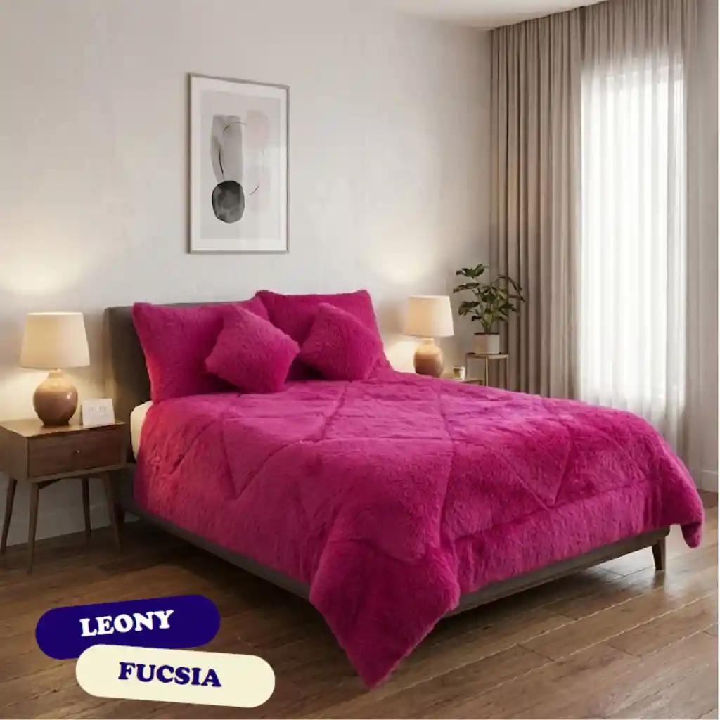 Cubrelecho Doble Peludo Fucsia 5 Piezas, doble faz con piel de ángel. Medidas: Para cama doble 140 x 190 cm Plumón: 220x240 cm Dos fundas: 50x70 cm Dos cojines con relleno siliconado: 35x35 cm Si deseas otra medida puedes contactarnos Cubrelecho de alta calidad, tela en terciopelo peluche por uno de sus lados y el otro piel de ángel. Relleno de fibra siliconada. Costura especial que asegura el relleno a largo plazo. Hecho en Colombia. Cubrelecho, Cubrecama, Edredon, Plumon