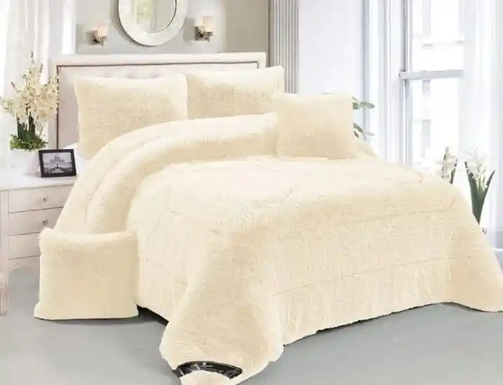 Este diseño es tendencia, perfecto para darle a tu habitación un toque de estilo y glamour. Cubrelecho unicolor de una textura extra suave, elaborado en tela felpa pelo largo y sherpa tipo ovejero. Incluye 1 Cubrelecho 260 x 240 cm, 2 Fundas 55 x 75 cm, 2 Forro de cojin 48 x 48 cm.(verificar disponibiliad de producto).