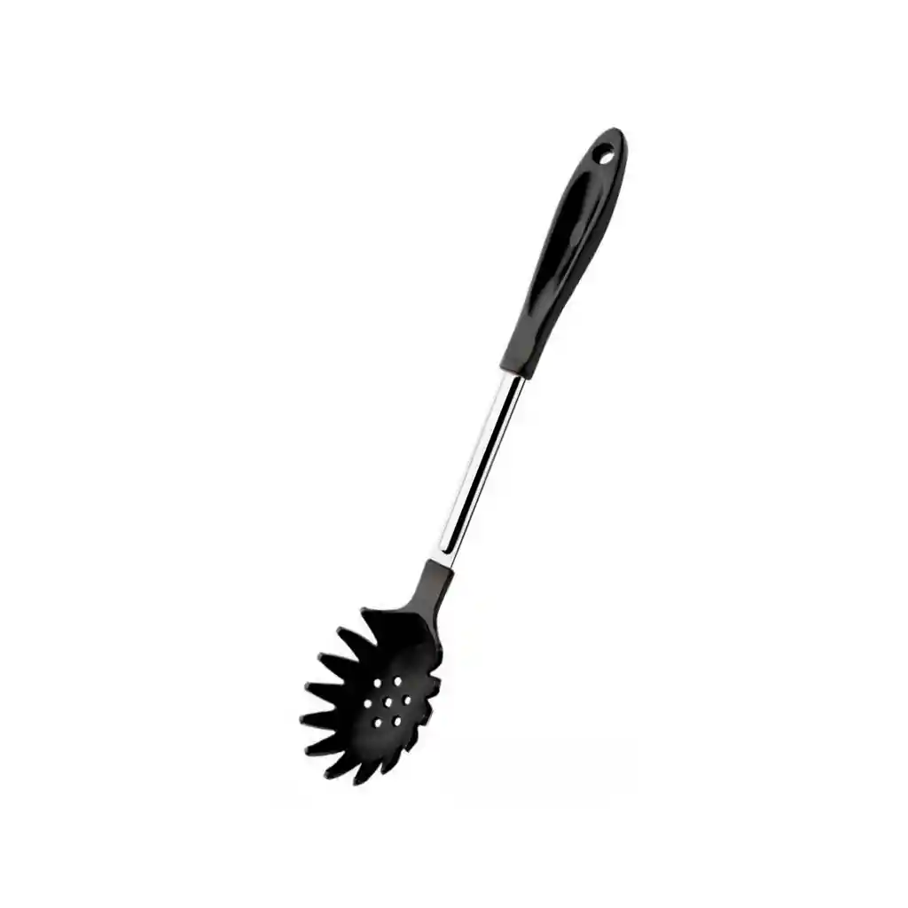Cuchara para espaguetti en nylon resistente. Parte del mango en acero inoxidable. Longitud total de 32 cm. Acabado plateado y negro moderno. Cabeza de 10.6 cm funcional. Mango metálico de 10 cm firme. Empuñadura en nylon de 9.6 cm. Espesor del cabo de 2 mm. Ideal para servir pasta sin dañar ollas. Resistente al calor y uso diario. Diseño ergonómico y práctico. Fácil limpieza y mantenimiento. No absorben olores ni sabores. La imagen ha sido ambientada; no incluye accesorios adicionales y el color puede variar según la iluminación.