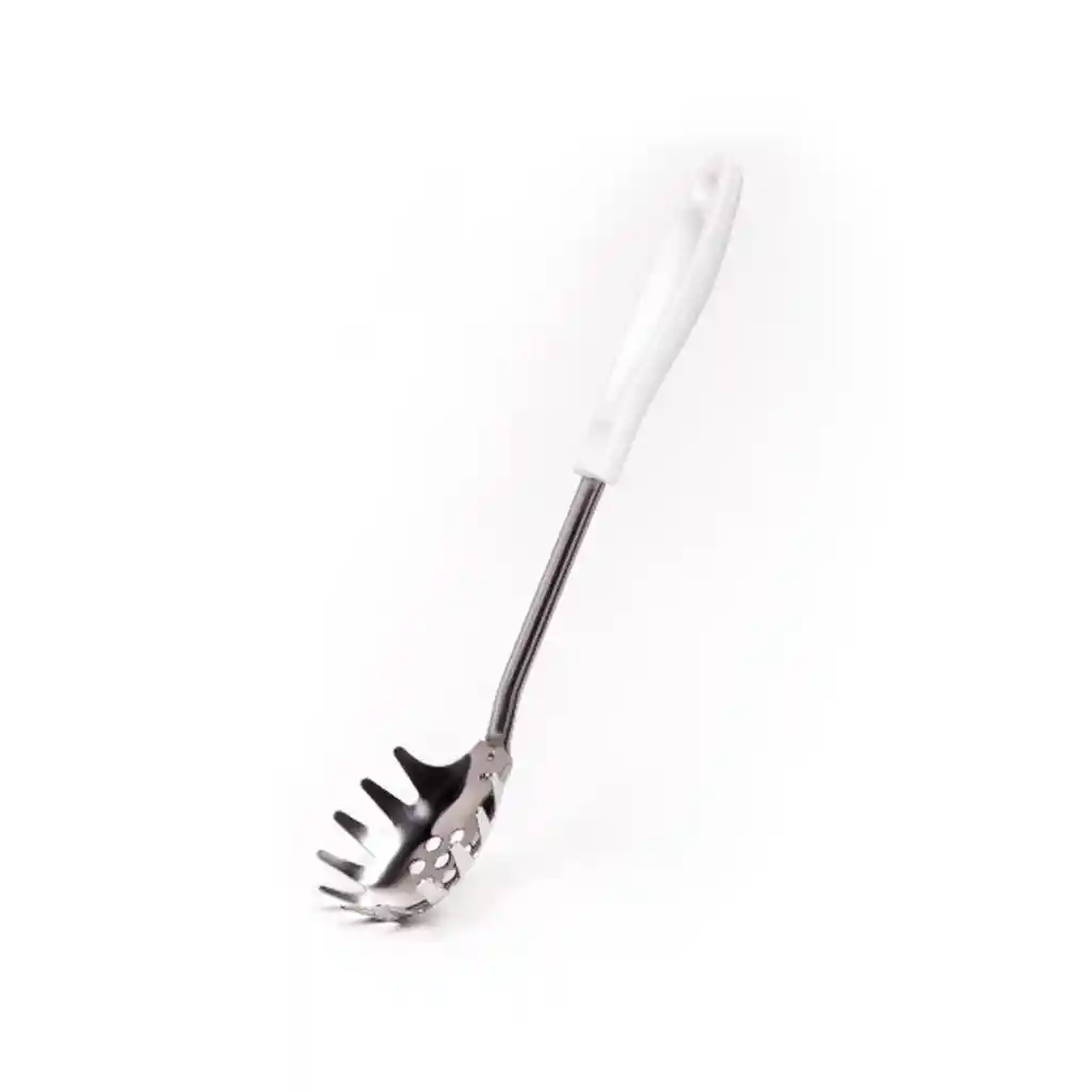 Fabricado en acero resistente . Mango blanco en polipropileno resistente. Longitud total de 31cm. Acabado plateado y blanco moderno. Mango de 12.7 cm cómodo. Espesor de 1 mm duradero. Ideal para servir pasta fácilmente. No se oxida con uso adecuado. Material higiénico y resistente. Diseño ergonómico y práctico. Fácil de limpiar y mantener. No absorben olores ni sabores. Perfecto para restaurantes o hogar. La imagen ha sido ambientada; no incluye accesorios adicionales y el color puede variar según la iluminación.