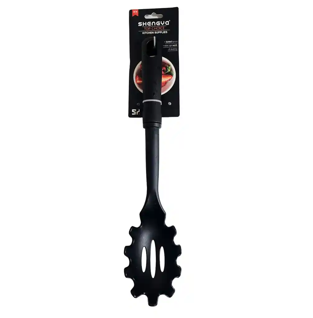Cuchara para pasta de cocina elaborada en material resistente, diseñada con ranuras y bordes en forma de dientes que facilitan servir y escurrir espaguetis u otros tipos de pasta de manera práctica; su mango ergonómico con orificio permite un agarre cómodo y la opción de colgarla, convirtiéndola en un utensilio indispensable para preparar y servir tus platillos favoritos. Ficha Técnica: Dimensiones: 33 cm x 7 cm Material : nylon reforzado o poliamida Referencia: WM-72 ** _Para defectos de fábrica o retractos: \_Por favor revise el producto apenas lo reciba y antes de usarlo. No aplican ley de retracto o defectos de fábrica luego de usar el producto. Se manejan máximo 5 días para reportar defectos de fábrica (por ejemplo, producto funciona mal, piezas faltantes, rotas, etc). Para hacer efectiva la devolución el producto debe devolverse con el empaque original, el cual debe estar en buen estado, incluir todos los documentos y las partes completas y sin daños.