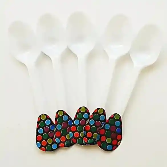 CUCHARAS PLASTICAS FONDO NEGRO PUNTOS DE COLORES X 20