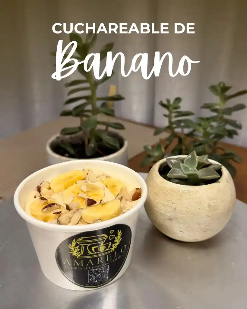 Cuchareable de base de torta y relleno de banano y crumble de nueces.