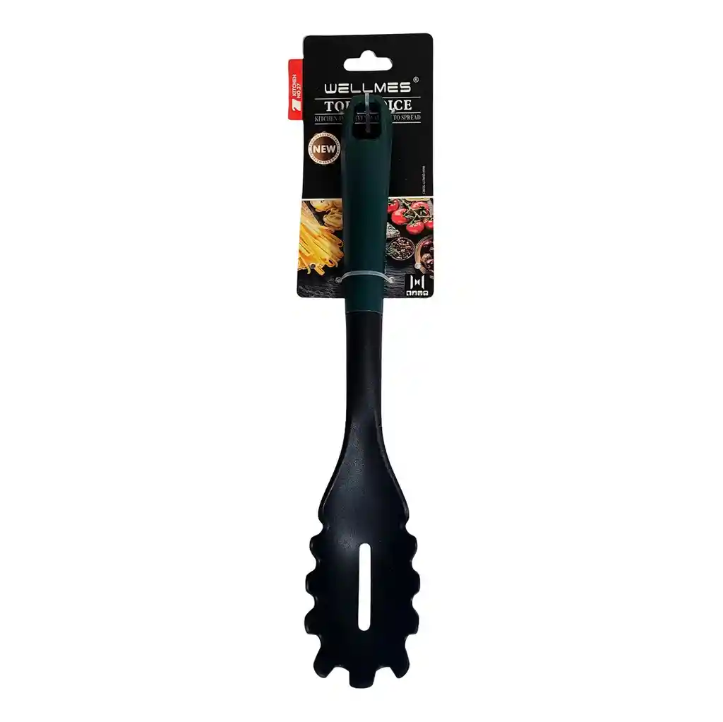 Este cucharón para pasta está diseñado con bordes dentados que facilitan el agarre y servido de espaguetis y otros tipos de pasta larga, evitando que se resbalen al momento de servir. Fabricado en material resistente al calor, combina un mango ergonómico en tono verde con un cuerpo negro que brinda durabilidad y comodidad en su uso. Además, cuenta con un orificio en el mango que permite colgarlo fácilmente, manteniendo la cocina organizada y práctica. Ficha Técnica: Dimensiones: 32 cm x 6 cm x 6 cm Material : nylon reforzado o poliamida Referencia: WM-107 ** _Para defectos de fábrica o retractos: \_Por favor revise el producto apenas lo reciba y antes de usarlo. No aplican ley de retracto o defectos de fábrica luego de usar el producto. Se manejan máximo 5 días para reportar defectos de fábrica (por ejemplo, producto funciona mal, piezas faltantes, rotas, etc). Para hacer efectiva la devolución el producto debe devolverse con el empaque original, el cual debe estar en buen estado, incluir todos los documentos y las partes completas y sin daños.