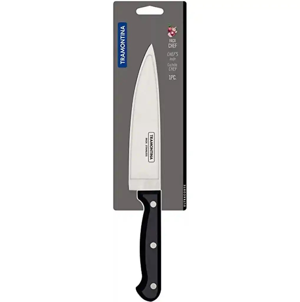 America Store te trae Cuchillo Chef Tramontina Ultra Corte 8” 23861/108 Con el cuchillo Chef Tramontina Ultracorte con lámina de acero inoxidable y mango de polipropileno negro de 8 pulgadas, usted va a elevar la categoría de sus recetas. Para aumentar la durabilidad del filo, recibe un tratamiento térmico, dejando el producto más resistente. El mango de polipropileno en el elegante color negro es cómodo y tiene protección antimicrobiana que inhibe el crecimiento de hongos y bacterias. Se puede lavar en lavavajillas.