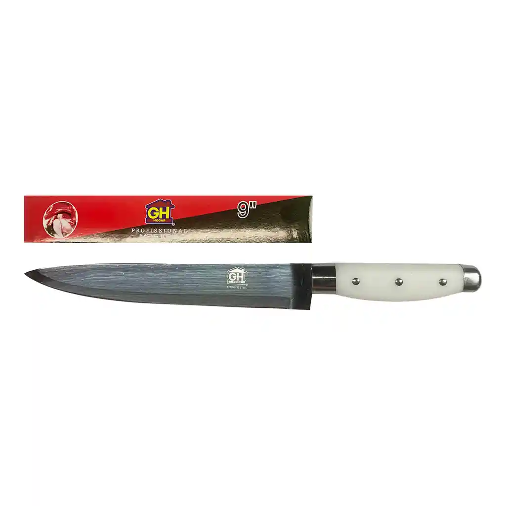 Cuchillo de cocina de 9" con mango blanco ergonómico, ideal para cortes precisos de carnes, frutas y verduras. Resistente, afilado y fácil de manejar para uso diario en el hogar o negocio.