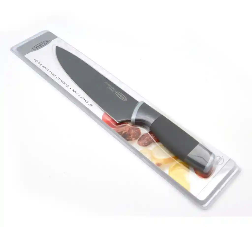 America Store te trae Cuchillo De Cocina Para Chef 20 Cm Antiadherente Press Modelo: 76984 Línea profesional. Hoja de acero inoxidable con recubrimiento antiadherente, con mango antiresbalante. Mango ergonómico para un agarre seguro y cómodo. Ideal para cortar, rebanar y picar verduras, vegetales, frutas y carnes. Materiales: Mango en plástico y goma antiresbalante con hoja en acero inoxidable con recubrimiento antiadherente. Uso: Ideal para cortar, rebanar y picar verduras, vegetales, frutas y carnes. Cuidados: Antes de utilizar, lavar con agua y secar inmediatamente. No exponer el mango al calor, ni colocar directamente sobre superficies calientes. Lamina afilada y punzo penetrante. Manipular con cuidado y mantener fuera del alcance de los niños.