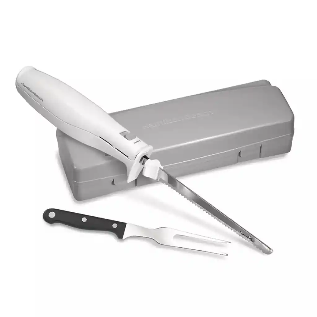 Ideal para trinchar carnes, cortar pan artesanal e incluso materiales para manualidades, el cuchillo eléctrico Hamilton Beach® ofrece cortes rápidos, uniformes y sin esfuerzo gracias a su motor de 120 watts y cuchillas dentadas de acero inoxidable con movimiento recíproco. Su diseño ergonómico y liviano con control por gatillo lo hace cómodo y fácil de usar, incluso en cortes prolongados. Además, su cable extralargo de 1.5 metros (5 pies) brinda libertad de movimiento para cortar directamente en la mesa o trabajar en proyectos de bricolaje. Incluye un tenedor para trinchar y un estuche compacto de almacenamiento que mantiene todo organizado en un solo lugar. Precisión, comodidad y potencia en cada rebanada. ¡Tu aliado perfecto para cocina y creatividad!