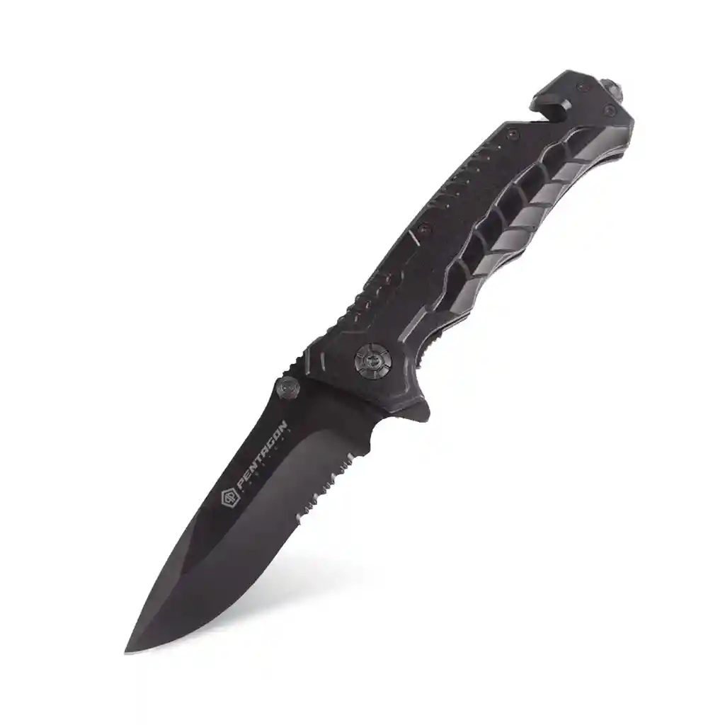 Excelente y práctica navaja Pentagon que se convertirá en tu compañero ideal para todas tus actividades, aventuras y trabajos al aire libre ¡Te ayudará a mantenerte seguro y protegido en todo momento! - Mango ergonómico antideslizante. - Agarre cómodo: Suave al tacto, extremadamente duradero, ligero y resistente a los cambios de humedad y temperatura. Cómodo mango proporciona un agarre sustancial. - Cuenta con nula absorción a la humedad, asegurando una mayor durabilidad - Cuchillo táctico: con sistema de apertura seguro y fácil y navaja resistente al uso, fabricado con materiales duraderos y que perduran independiente de su uso. - Compacto y práctico, fácil de llevar a cualquier lugar. - Navaja con clip para cinturón, cárgala segura y a la mano. - Cuchillo multiuso, ya sea para el trabajo, las tareas domésticas, la navaja de supervivencia en el coche, pesca, caza, camping, ciclismo, etc. - Con forro de bloqueo simple y confiable que es resistente a la suciedad y evita el cierre accidental. - Según el modelo puede incluir rompe vidrios y corta cables, ideal para accidentes. ----------------------------------------------------------------------- FICHA TÉCNICA - Navaja de bolsillo Pentagon - Resistente a cambios de clima y temperatura. - Ideal para acampar y actividades al aire libre. Modelo Ghost: - Material Mango: G10 - Incluye estuche de nylon balístico - Color: Gris con negro - Medidas cuchillo extendido: 22 cm - Medidas cuchillo cerrado: 14 cm - Longitud de la hoja: 8 cm - Peso navaja: 258 grs Modelo Hannibal: - Material mango: aluminio - Material hoja: Acero inoxidable 420 - Incluye estuche de nylon balístico - Color: Negro - Medidas cuchillo extendido: 21,3 cm - Medidas cuchillo cerrado: 12,5 cm - Longitud de la hoja: 9 cm - Peso navaja: 144 grs Modelo Bones: - Dureza hoja: hasta 55HRC - Incluye estuche de nylon balístico - Color: Gris - Medidas cuchillo extendido: 22 cm - Medidas cuchillo cerrado: 12,1 cm - Ancho de la hoja: 35 mm - Longitud de la hoja: 9 cm - Peso navaja: 210grs Modelo Black: - Material: Acero inoxidable de alta calidad - Dureza hoja: Hasta 57HRC - Con Rompeventana y cortacable - Cuchilla recta y tipo cierra - Medidas Caja: 4,7 x 3,5 x 2,3 cm - Peso navaja: 138 gr Modelo Gray/Black: - Material: Acero inoxidable de alta calidad - Dureza hoja: Hasta 57HRC - Con Rompeventana y cortacable - Medidas Caja: 4,7 x 3,5 x 2,3 cm - Peso navaja: 224 gr Modelo Gray/Brown: - Material: Acero inoxidable de alta calidad - Dureza hoja: Hasta 57HRC - Medidas Caja: 4,7 x 3,5 x 2,3 cm - Peso navaja: 163 gr ----------------------------------------------------------------------- QUE INCLUYE TU COMPRA - 1 Navaja de bolsillo Pentagon - 1 Estuche de Nylon Balístico. (Según el modelo) **PENTAGON® es distribuida en Colombia y Sudamérica exclusivamente por Builder Commerce SAS** ----------------------------------------------------------------------- PREGUNTAS FRECUENTES: ¿El precio indicado incluye IVA? Si, si incluye IVA el precio publicado. ¿Los productos tienen garantía? Sí. Todos nuestros productos cuentan con 6 meses de garantía limitada contra defectos de fabricación.