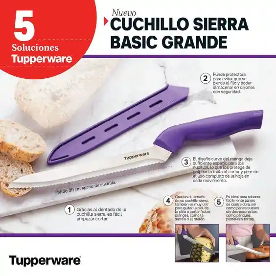 Prepara tus recetas preferidas como todo un Chef, este cuchillo tipo sierra es una herramienta indispensable, gracias al dentado de la cuchilla es ideal para empezar a cortar, posee una funda protectora para guardar y transportarlo con seguridad e higiene. 100% de acero inoxidable de alta calidad, es muy afilada, resistente a la corrosión, su diseño curvo deja el espacio necesario para los nudillos, lo que permite el uso completo de la hoja en cada movimiento; así mismo es genial para cortar la corteza de la piña o frutas grandes como la patilla, panes suaves o duros. Siempre use una superficie de corte adecuada. Libre de BPA. Dimensiones: 34.8 cm de largo.