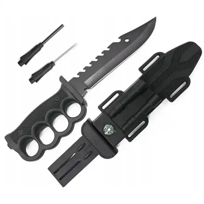 Cuchillo Táctico Camping Supervivencia Pesca Estuche + Pedernal Cuchillo De Supervivencia, especialmente diseñado para situaciones de aventura al aire libre, combate, caza o supervivencia. Este cuchillo tiene las cualidades de un gran cuchillo de combate, es muy liviano y cuenta con un práctico estuche. Un cuchillo resistente y duradero para tareas especiales, adecuado para condiciones extremas, donde sea necesario el uso de herramientas de supervivencia. Un viaje todoterreno, de pesca, en tienda de campaña o en el bosque: un cuchillo afilado puede resultar una herramienta indispensable en diversas situaciones. Cocinar al aire libre con este cuchillo es un placer, es perfecto para cortar carne, pescado, verduras, hierbas y muchos otros. Preparar lanzas para una hoguera o cortar combustible pequeño con este cuchillo es muy sencillo. Un cuchillo grande con hoja FULL TANG, dentado en el lomo. Mango de plástico antideslizante en forma de nudillo de latón. Golpeador al final del mango. Dentados en la parte posterior de la hoja. Bien equilibrado y cómodo de usar.