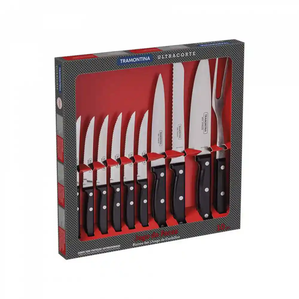 Juego cuchillos 10 piezas en acero inoxidable, mangos en propileno reistente, color negro composicion: 6-cuchillos asados 5" 1- cuchillo pan 7" 1-cuchillo cocina 6" 1-cuchillo chef 7" 1- tenedor trinchante ultracorte