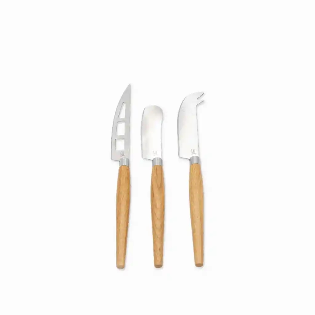 Este set trae tres cuchillos para el queso, cada uno con una función especial: El punzón es un cuchillo multipropósito: Es perfecto para separar la cubierta dura de los quesos, hacer cortes en grandes trozos y cortar en pequeños cuadritos para picar. La pala para esparcir es ideal para untar quesos suaves en galletas u otro acompañante. El tenedor se usa para sostener un bloque de queso mientras se corta o taja con un cuchillo, funciona muy bien para quesos madurados y deshacer quesos desmenuzables.